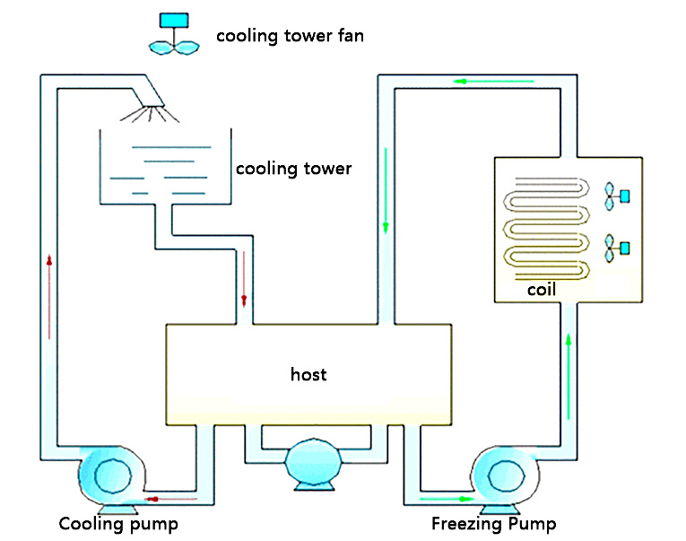 This section consists of a cooling pump, cooling water pipeline, and cooling water tower. The chilled water circulation system, while conducting indoor heat exchange, will inevitably take away a large amount of indoor heat energy. This heat energy is transferred to the cooling water through the refrigerant inside the host, causing the temperature of the cooling water to rise. The cooling pump will feed the heated cooling water pressure into the cooling water tower, allowing it to exchange heat with the atmosphere.